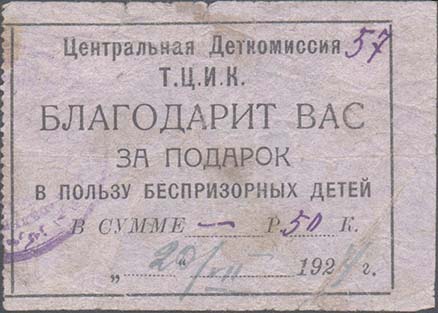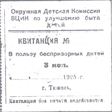 1925 г. Листок из квитанционной книжки разм. 63 х 63 мм. Одноцветная печать на желтоватой бумаге. Левосторонняя зубц. 11 1/2. В центре текст в пять строк: «Квитанция №... В пользу беспризорных детей ... коп. «...»...1925 г.» г. Тюмень. Сверху текст в три строки: «Окружная Детская Комиссия ВЦИК по улучшению быта детей». Внизу текст: «Квитанция без печати недействител[ьна].».