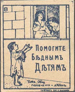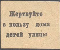 1922 г. 09.12.1922 г. Разм. 28 х 34 мм. Одноцветная печать желтоватой бумаге. В центре текст в три строки: «Жертвуйте в пользу дома детей улицы».
