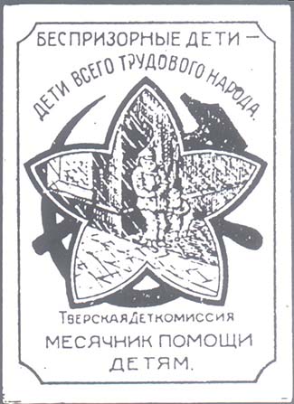 1930(?) г. Разм. 54 х 74 мм. Одноцветная печать на сероватой бумаге. В центре в линейной рамке со скошенными краями разм. 49 х 68 мм двойная рамка в виде пятиконечная звезды на фоне серпа и молота. В центре двое беспризорников на фоне фасада дома». Сверху текст в две строки: «Беспризорные дети – дети всего трудового народа». Внизу текст в три строки: «Тверская Деткомиссия. Месячник помощи детям».