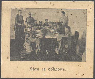 1925(?) г. Разм. 34 х 36 мм. Двухцветная печать на кремовой бумаге. В центре в двойной прямоугольной рамке разм. 29 х 33 мм двойная круглая рамка диаметром 23,5 мм. В круглой рамке большая группа детей с плакатом, на котором на русском и грузинском языках текст: «Дайте нам детсады». Тот же текст на двух языках сверху и снизу рамки.