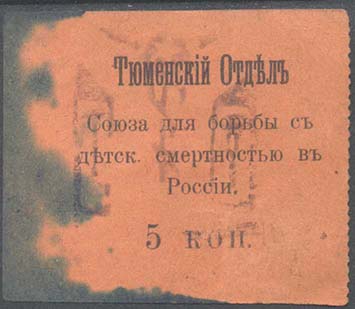 1915(?) г. Корешок квитанции 59 х 50 мм. Одноцветная печать на оранжево-красной бумаге. Правосторонняя нерегулярная зубц. В центре текст в пять строк: «Тюменский Отдел Союза для борьбы с детск[ой]. смертностью в России». Внизу номинал.