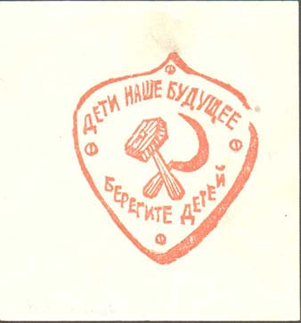 1924 г. Разм. 56 х 61 мм. Одноцветная печать на белой бумаге. В центре в фигурной рамке серп и молот. По периметру рамки текст: «Дети наше будущее. Берегите детей».