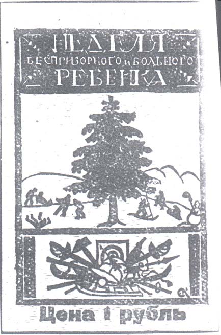 1925 г. Разм. 70 х 108 мм. Одноцветная печать на толстой серо-зеленой бумаге. В центре в прямоугольной рамке разм. 63 х 91 мм елка, горки и играющие дети. Сверху текст в три строки: «Неделя беспризорного и больного ребенка». Внизу разнообразный спортивный инвентарь. Внизу номинал: «Цена 1 рубль».