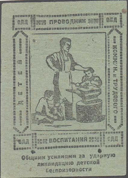 1924(?) г. Разм. 70 х 98 мм. Одноцветная печать на тонкой зелено-серой бумаге. В центре в прямоугольной рамке разм. 42 х 54 мм рабочий и двое детей. По периметру рамки с наружной стороны в декоративных рамках текст: «ОДД проводник комун[нистического]. и трудового воспитания детей». Внизу текст в три строки: «Общими усилиями за ударную ликвидацию детской беспризорности».