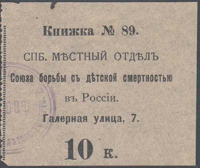 1914(?) г. Листок из квитанционной книжки разм. 66 х 55 мм. Левосторонняя зубц. 11 1/2. Текст в пять строк: «Книжка № ... СПБ. Местный отдел Союза борьбы с детской смертностью в России. Галерная улица, 7.». Внизу номинал. Слева вертикальная линия из коротких горизонтальных штрихов.