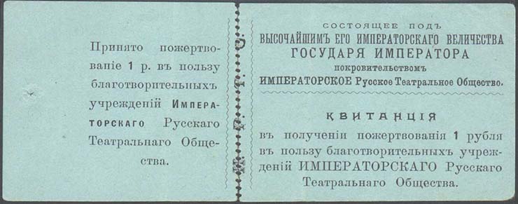 1914(?) г. Листок из квитанционной книжки разм. 82 х 50 мм. Правосторонняя зубц. 11 1/2. Одноцветная печать на белой бумаге. В центре текст в шесть строк: «Пожертвование в пользу Общества вспомоществования бывшим и настоящим воспитанникам Гимназии Человеколюбивого Общества. (Крюков канн[ал]., 15)». Сверху номер нумероатором. Слева внизу номинал.