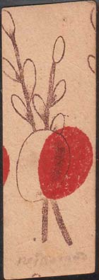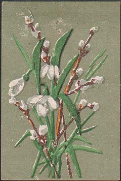 1915(?) г. Разм. 41 х 62 мм. Многоцветная печать на сероватой бумаге с мелованным верхним слоем. В центре букет из веток вербы и подснежников.