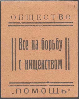 1924(?) г. Разм. 42 х 54 мм. Одноцветная печать на бумаге различных цветов. Текст: «Общество «Помощь». Все на борьбу с нищенством».