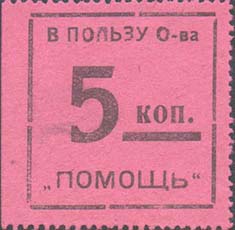 1924(?) г. Разм. рамки 32 х 33 мм. Одноцветная печать на розово-фиолетовой бумаге. Зубц. 11 1/2. В центре номинал. Сверху текст: «В пользу О-ва». Внизу продолжение текста: ««Помощь»».