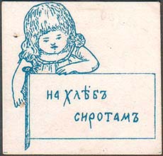 1915(?) г. Разм. 38 х 36 мм. Одноцветная печать на сероватой бумаге с мелованным верхним слоем. В центре девочка, держащая флажок с текстом в две строки: «Сиротам на хлеб».