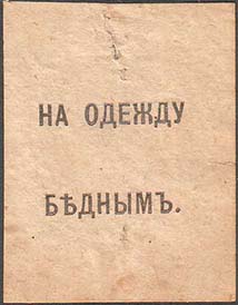 1915(?) г. Разм. 35 х 45 мм. Одноцветная печать на желтоватой бумаге. В центре текст в две строки: «На одежду бедным».