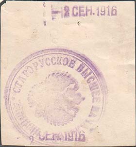 1916 г. Разм. 48 х 52 мм. Одноцветная печать на белой бумаге. На лицевой стороне фиолетовый оттиск круглой печати училища диаметром 37 мм. В центре печати герб России. По окружности текст: «Старорусское высшее начальное училище». Также на лицевой стороне ручным штампом фиолетовый оттиск даты: «2 сент. 1916».