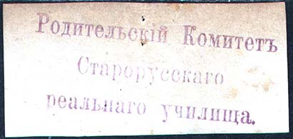 1917 г. 24.-25.09.1917 г. Разм. 67 х 31 мм. Одноцветная печать на желтоватой бумаге. Текст в три строки: «Родительский Комитет Старорусского реального училища». Сбор в пользу ученической столовой.