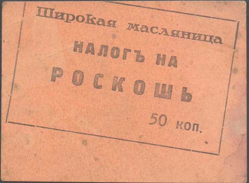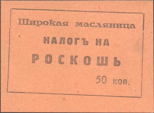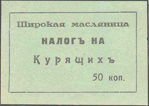 1914(?) г. Разм. рамки 73 х 46 мм. Одноцветная печать на бумаге различных цветов. В рамке сверху текст: «Широкая масляница». В правом нижнем углу номинал. В центре различные тексты в две строки.
