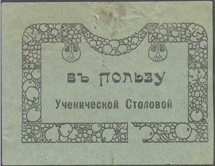 1916(?) г. Разм. 72 х 55 мм. Одноцветная печать на зеленой бумаге. В декоративной рамке из растительного орнамента текст в две строки: «В пользу ученической столовой».