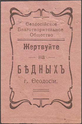 1916 г. Разм. 46 х 69 мм. Одноцветная печать на темно-серой бумаге. В фигурной декоративной рамке разм. 38 х 57 мм в центре текст в четыре строки: «Жертвуйте на бедных г. Феодосии». Сверху и снизу декоративные элементы в виде горизонтальных штрихов. Сверху текст в три строки: «Феодосийское Благотворительное Общество».