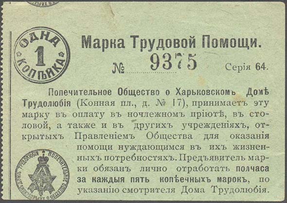 1912(?) г. Листок из квитанционной книжки разм. 99 х 69 мм. Одноцветная печать светло-зеленой бумаге. Левосторонняя зубц. 11 1/2. Сверху в центре текст в две строки: «Марка Трудовой Помощи. №... Серия ...». Слева в двойной круглой рамке номинал. Ниже текст в десять строк: «Попечительное Общество о Харьковском Доме Трудолюбия (Конная пл., д. № 17), принимает эту марку в оплату в ночлежном приюте, в столовой, а также и в других учреждениях, открытых Правлением Общества для оказания помощи нуждающимся в их жизненных потребностях. Предъявитель марки обязан лично отработать полчаса за каждые пять копеечных марок, по указанию смотрителя Дома Трудолюбия». В левом нижнем углу эмблема общества.