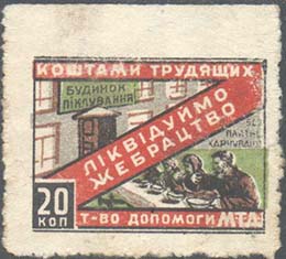 1932(?) г. Многоцветная печать на белой рыхлой бумаге. Текст на украинском языке: «Средствами трудящихся ликвидируем нищенство. Отделение общества Г[ородских] О[бществ] П[помощи]».