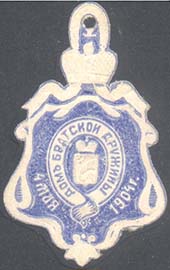 1904 г. 04.05.1904 г. Виньетка в виде щитка сложной формы разм. 28 х 45 мм с ушком для крепления. Одноцветная печать на белой бумаге с тиснением. Изображение знака одного из благотворительных обществ.