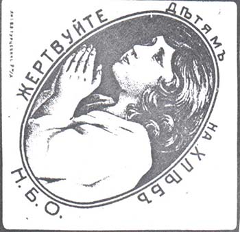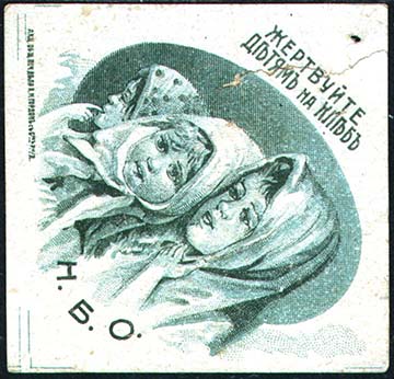 1915(?) г. Ромб разм. 82 х 82 мм. Одноцветная печать на желтоватой бумаге с мелованным верхним слоем. В центре три девочки в платках. Сверху текст в две строки: «жертвуйте детям на хлеб». Внизу полукругом аббревиатура «Н.Б.О.». Слева выходные данные мелким шрифтом: «Акц. общ. печ. дела А.М. Гордон с с-м Р. н/Д.».