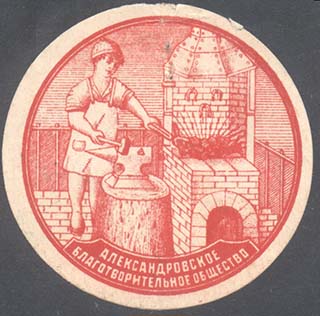 1915(?) г. Круг диаметром 52 мм. Одноцветная печать на белой бумаге. В двойной круглой рамке диаметром 47 мм кузнец за наковальней, рядом с горном. Внизу полукругом текст в две строки: «Александровское благотворительное общество».