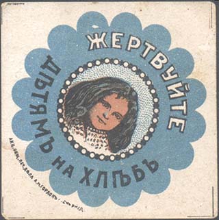 1915(?) г. Ромб разм. 75 х 75 мм. Трехцветная печать на плотной белой бумаге. В декоративной рамке голова девочки. Круговая надпись на светло-синем фоне: «Жертвуйте детям на хлеб». Внизу выходные данные мелким шрифтом: «Акц. общ. печ. дела А.М. Гордон ..... Рн/Д.» Сбор помощи неимущим.