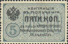 1912(?) г. Всероссийский сбор. 1912(?) г. Разм. рамки 25 х 40 мм. Зубц. 11 1/2. Трехцветная печать на плотной кремовой бумаге. В прямоугольной рамке на декоративном фоне слева вверху герб России, слева внизу номинал в круге. Справа на фоне аббревиатуры «ИЧО» текст в шесть строк: «Квитанция в получении пяти коп. в пользу Императорского Человеколюбивого Общества на бедных». Различные цвета фона и сетки.