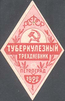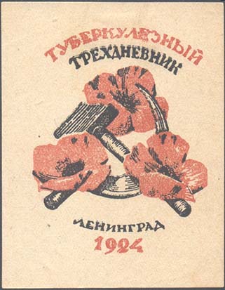 1924 г. Разм. 54 х 68 мм. Двухцветная печать на желтоватой бумаге. В центре серп и молот и три цветка мака. Сверху полукругом текст в две строки: «Туберкулезный трехдневник». Внизу полукругом текст в две строки: «Ленинград 1924».