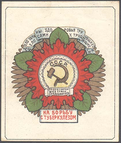 1924 г. 23-31.05.1924 г. Разм. рамки 68 х 82 мм. Многоцветная печать на плотной белой бумаге. В прямоугольной рамке со срезанными углами на фоне растительного орнамента в круглой рамке серп и молот в лучах восходящего солнца. Сверху аббревиатура «С.С.С.Р.». Внизу на ленте текст в три строки: «Пролетарии всех стран соединяйтесь». Сверху на ленте текст в две строки: «Дело охраны здоровья трудящихся – дело самих трудящихся». Внизу в прямоугольной рамке текст в две строки: «На борьбу с туберкулезом».