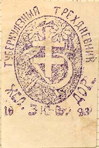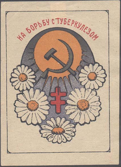 1925(?) г. Разм. 53 х 56 мм. Двухцветная печать на желтоватой бумаге. Сверху красный крест и серп и молот. Внизу цветок ромашки. Текст семь строк: «З-х дневник. Туберкулез враг пролетариата и его детей». По углам разграничительные линии.