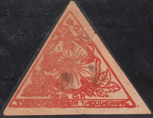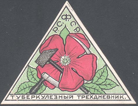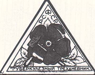 1926 г. 28-30.05.1926 г. Треугольник разм. рамки 73 х 55 мм. Трехцветная печать на сероватой бумаге с мелованным верхним слоем. В центре в треугольной рамке на фоне из вертикальных штрихов цветок мака, серп и молот. Сверху по внутреннему контуру рамки аббревиатура «Р.С.Ф.С.Р.». Внизу текст: «Туберкулезный трехдневник».