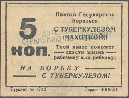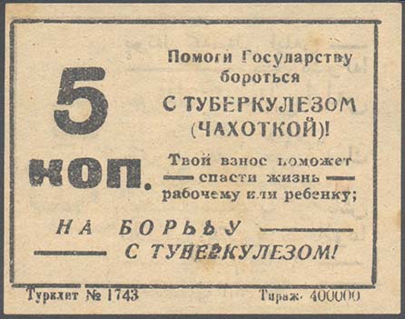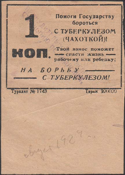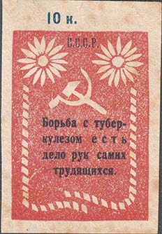 1925(?) г. Разм. 38 х 57 мм. Трехцветная печать на плотной белой бумаге. На сплошном фоне сверху серп и молот и два цветка ромашки. Ниже в стилизованной рамке текст в четыре строки: «Борьба с туберкулезом есть дело рук самих трудящихся». Сверху номинал.