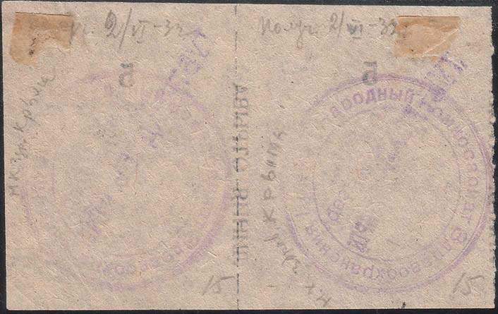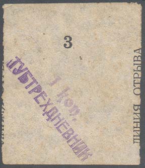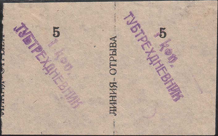 1932 г. 02.07.1932 г. Разм. 45 х 54 мм. Одноцветная печать на желтоватой бумаге. Сверху в центре номер, проставленный нумератором. Слева и справа вертикально по полям знака текст снизу вверх: «Линия отрыва» и пунктирная линия. По диагонали в две строки фиолетовый оттиск штампа с текстом: «1 коп. Тубтрухдневник». На оборотной стороне фиолетовый оттиск круглой печати диаметром 39 мм. На печати по окружности текст: «Народный Комиссариат Здравоохранения Крыма». В центре печати текст неразборчиво.