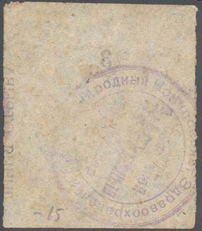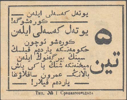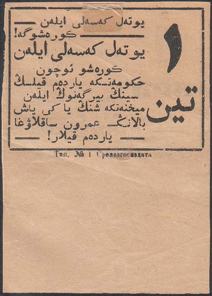 1924 г. Август. Разм. 74 х 56 мм. Одноцветная двухсторонняя печать на тонкой желтоватой бумаге. На лицевой стороне в прямоугольной рамке разм. 68 х 49 м слева номинал. Справа текст в семь строк: «Помоги Государству бороться с туберкулезом (чахоткой)! Твой взнос может спасти жизнь рабочему или ребенку». Ниже текст в две строки: «На борьбу с туберкулезом!». Внизу под рамкой выходные данные мелким шрифтом. На оборотной стороне в прямоугольной рамке разм. 68 х 49 м справа номинал на узбекском языке арабским шрифтом. Слева текст в девять строк на узбекском языке арабским шрифтом. Внизу под рамкой выходные данные мелким шрифтом: «Тип. №1 Средазгосиздата».