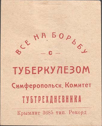 1928(?) г. Разм. 57 х 70 мм. Одноцветная печать на желтоватой бумаге. В центре текст в две строки: «Симферопольск[ий]. Комитет тубтрехдневника». Сверху текст в три строки: «Все на борьбу с туберкулезом». Внизу мелким шрифтом выходные данные: «Крымлит 3685. Тип. Рекорд».