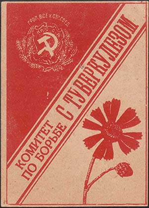 1928(?) г. Разм. 50 х 70 мм. Одноцветная печать на плотной желтоватой бумаге. В левом верхнем углу на сплошном фоне герб Кр.С.С.Р. В правом нижнем углу цветок гвоздики. По диагонали текст в две строки: «Комитет по борьбе с туберкулезом».