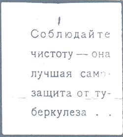 1923 г. 02.06.1923 г. Разм. 40 х 45 мм. Одноцветная печать на желтоватой бумаге. В центре текст в пять строк: «Соблюдайте чистоту – она лучшая самозащита от туберкулеза».