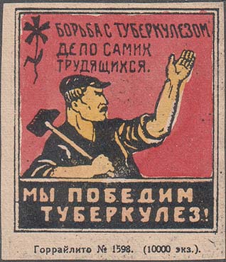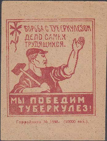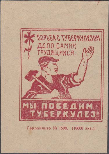 1926 г. Разм. 58 х 76 мм. Одноцветная печать на бумаге различных цветов. В двойной прямоугольной рамке разм. 49 х 54 мм в центре рабочий с молотом и поднятой левой рукой. Сверху текст в три строки: «Борьба с туберкулезом – дело самих трудящихся». В левом верхнем углу стилизованное изображение цветка. Внизу текст в две строки: «Мы победим туберкулез!». Внизу под рамкой мелким шрифтом выходные данные: «Горрайлито № 1598. (10000 экз.)».