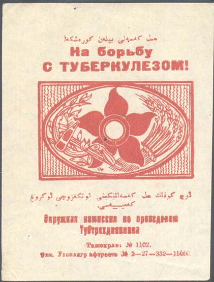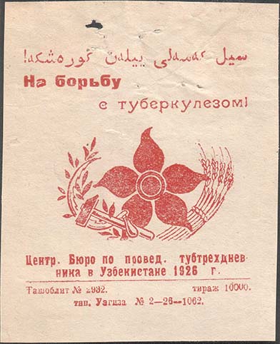 1926 г. Разм. 65 х 80 мм. Одноцветная печать на плотной белой бумаге. В центре стилизованное изображение цветка мака и скрещенные серп и молот в обрамлении венка из колосьев и лавровых ветвей. Сверху текст на узбекском языке арабским шрифтом. Ниже текст в две строки: «На борьбу с туберкулезом!». Внизу текст в две строки: «Центр[альное]. Бюро по провед[ению]. Тубтрехдневника в Узбекистане 1926 г.». Внизу под горизонтальной чертой мелким шрифтом выходные данные в две строки: «Ташоблит. №2932. Тираж 10000. Тип. Узгиза №2-26-1062».