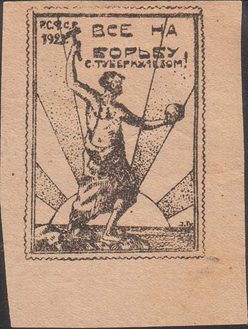 1923 г. Разм. 53 х 70 мм. Одноцветная печать на бумаге различных цветов. В двойной прямоугольной рамке (наружная имитирует зубцовку) в центре рабочий в фартуке на фоне лучей восходящего солнца. В левой руке рабочий держит череп, правая поднята над головой с молотом. В левом верхнем углу текст в две строки: «Р.С.Ф.С.Р. 1923». В правом верхнем углу текст в три строки: «Все на борьбу с туберкулезом!».