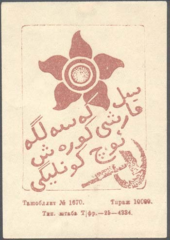 1926 г. Разм. 60 х 82 мм. Одноцветная печать на кремовой бумаге. В прямоугольной рамке с закругленными углами разм. 43 х 57 мм сверху стилизованное изображение цветка мака. Внизу по диагонали текст в три строки на узбекском языке арабским шрифтом. В правом нижнем углу серп и молот. Внизу под рамкой выходные данные в две строки мелким шрифтом: «Ташобллит №1670. Тираж 10000. Тип. штаба Т/фр. – 25 - 4334».