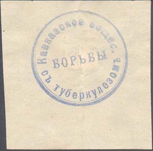 1915(?) г. Разм. 52 х 52 мм. Одноцветная печать на белой бумаге. В центре синий оттиск круглой печати диаметром 34 мм с текстом: «Кавказское общес[тво]. борьбы с туберкулезом».