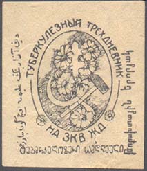 1923 г. 12.-14.05.1923 г. Разм. 35 х 40 мм. Одноцветная печать на желтоватой бумаге. В центре в овальной рамке разм. 18 х 24 мм серп и молот, шестиконечный крест и цветы ромашки. По наружному периметру рамки текст: «Туберкулезный трехдневник на ЗКВ. Ж.Д.» и орнамент из цветов. По периметру текст на трех языках.