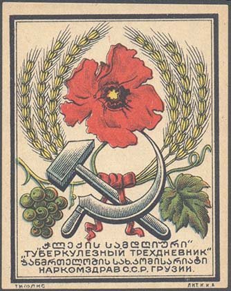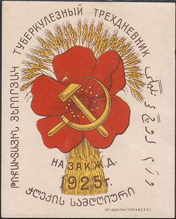 1931 г. 05.11.1931 г. Разм. 51 х 65,5 мм. Многоцветная печать на белой бумаге. В двойной прямоугольной рамке цветок мака в обрамлении венка из колосьев пшеницы и виноградной лозы. Внизу серп и молот. Ниже текст на русском и грузинском языках: ««Туберкулезный трехдневник» Наркомздрав С.С.Р. Грузии». Внизу под рамкой мелким шрифтом выходные данные: «Тифлис. Лит. К.К.А.».