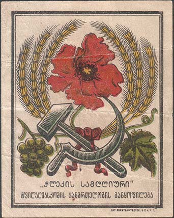 1925 г. 26.06.1925 г. Разм. рамки 50 х 65 мм. Многоцветная печать на белой бумаге. В двойной прямоугольной рамке цветок мака в обрамлении венка из колосьев пшеницы и виноградной лозы. Внизу серп и молот. Ниже текст грузинском языке в две строки». Внизу под рамкой мелким шрифтом выходные данные: «Лит. Полиграфтреста В.С.Н.Х.Г.».