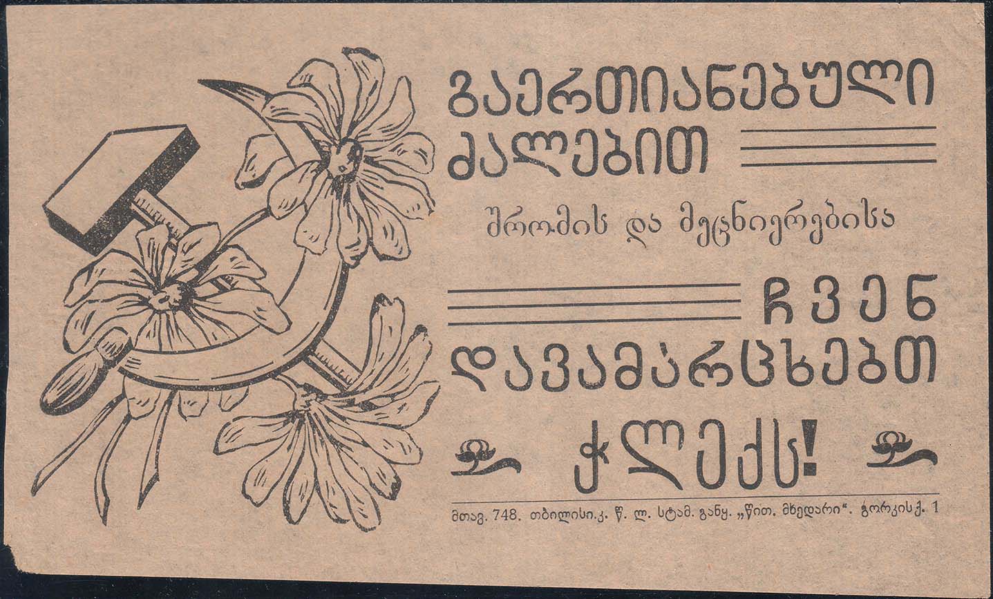 1931 г. Листок разм. 180 х 107 мм. Одноцветная печать на тонкой желто-серой бумаге. Слева скрещенные серп и молот и три цветка ромашки. Справа текст в шесть строк на грузинском языке. Внизу мелким шрифтом выходные данные на грузинском языке.