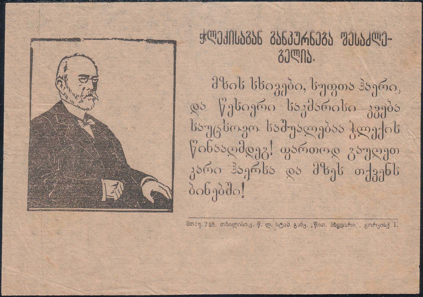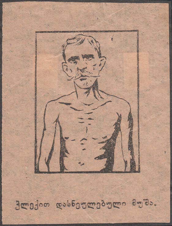 1931(?) г. Листок разм. 174 х 106 мм. Одноцветная печать на тонкой светло-палевой бумаге. Слева в прямоугольной рамке разм. 44 х 59 мм изображение больного туберкулезом человека. Чнизу под рамкой текст на грузинском языке: «Больной туберкулезом рабочий». Справа текст в восемь строк на грузинском языке: «Рабочие и крестьяне! Все на борьбу с туберкулезом! Туберкулез пролетарская болезнь, от которой особенно страдают бедные люди – рабочие и крестьяне. Общими усилиями трудящихся и специалистов мы победим туберкулез!». Справа внизу под чертой мелким шрифтом на грузинском языке выходные данные.