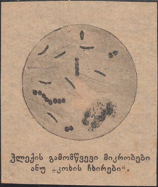 1931(?) г. Разм. 65 х 76 мм. Одноцветная печать на тонкой желтоватой бумаге. В центре в круглой рамке разм. 48 мм изображение бактерий – возбудителей туберкулеза под микроскопом. Внизу текст в две строки на грузинском языке: «Микробы возбудители туберкулеза – палочки Ко-ха».