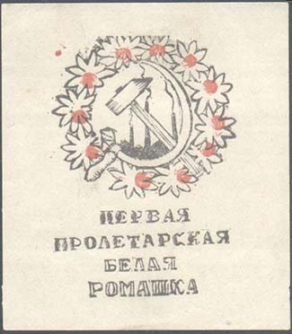 1923 г. 16.-18.02.1923 г. Разм. 54 х 61 мм. Двухцветная печать на белой бумаге. В центре серп и молот на фоне индустриального пейзажа в обрамлении венка из цветов ромашки. Внизу текст в четыре строки: «Первая пролетарская Белая Ромашка».
