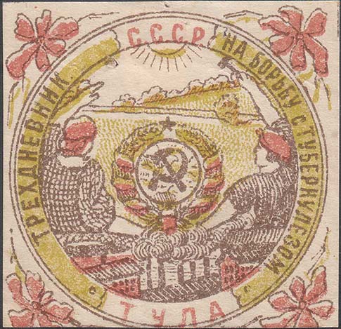 1924 г. Разм. 61 х 63 мм. Трехцветная печать на белой бумаге. В центре в тройной круглой рамке диаметром 58 мм герб СССР с шестью лентами на фоне аграрно- индустриального пейзажа. По бокам мужчина и женщина. По периметру между рамками текст: «С.С.С.Р. Тула. Трехдневник на борьбу с туберкулезом». По углам цветы мака и разграничительные линии.